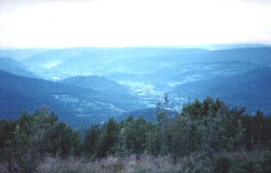 Clouds and dust haze appear white because they consist of particles larger than the wavelengths of light and scatter all wavelengths equally (Mie scattering). Sometimes there may be other particles in the air which are much smaller. Some mountainous regions are famous for their blue haze. Aerosols of terpenes from the vegetation react with ozone in the atmosphere to form small particles about 200 nm across which scatter the blue light. A forest fire or volcanic eruption may occasionally fill the atmosphere with fine particles of 500-800 nm across which are the right size to scatter red light. This gives the opposite to the usual Tyndall effect and may cause the moon to have a blue tinge since the red light is scattered out. This is very rare, literally once in a blue moon.