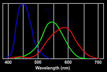 The white light from the sun is a mixture of all colours of the rainbow. This was demonstrated by Isaac Newton who used a prism to separate the different colours and so form a spectrum. The colours of light are distinguished by their different wavelengths. The visible part of the spectrum ranges from red light with a wavelength of about 720 nm to violet with a wavelength of about 380 nm with orange, yellow, green, blue and indigo between. The three different types of colour receptors in the retina of the human eye respond most strongly to red, green and blue wavelengths giving us our colour vision.